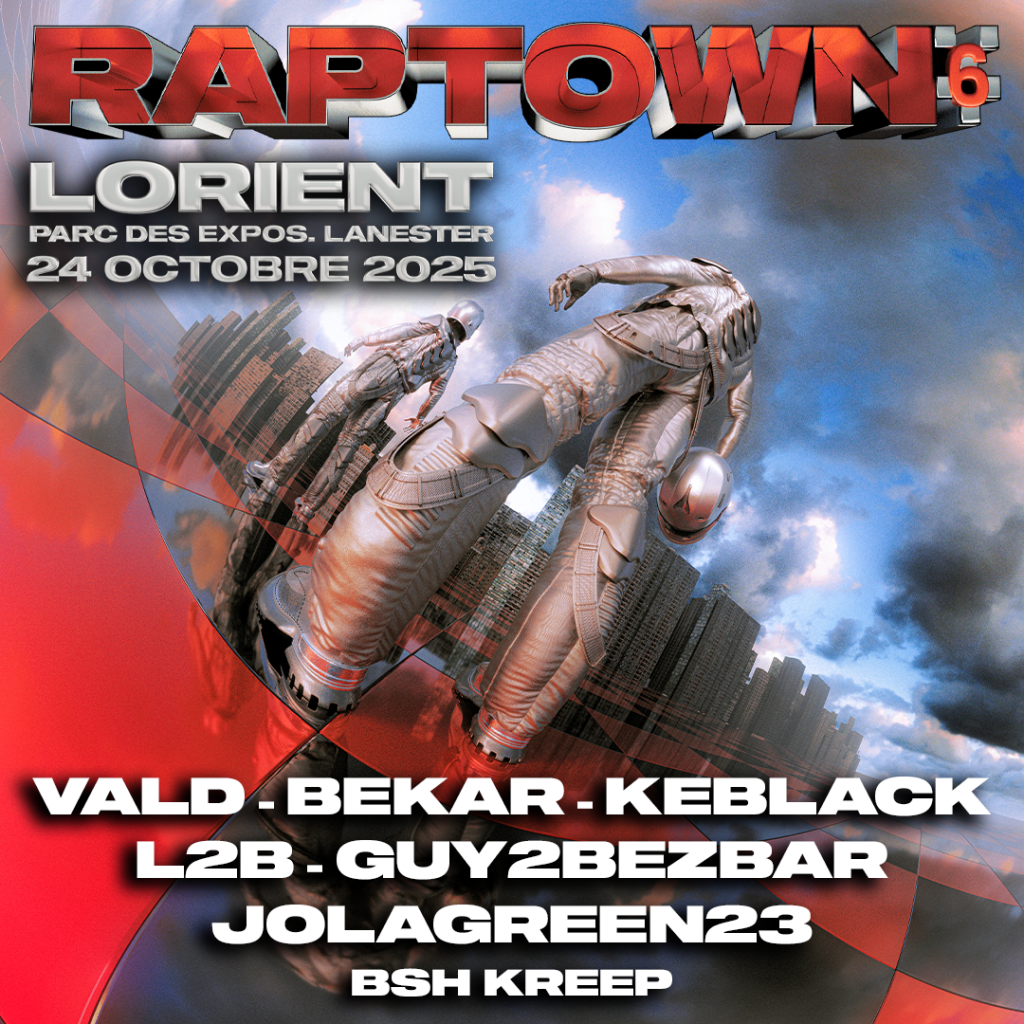 La team du Morbihan, on est de retour ! Nous vous donnons rendez-vous au Parc des Expositions de Lorient le vendredi 24 octobre 2025 pour le RAPTOWN #6. La formule demeure inchangée : une soirée dédiée aux musiques urbaines, avec 7 artistes, un parc des expositions et un public en folie ! Vald, Bekar, Keblack, L2B, Guy2bezbar, Jolagreen23 et BSH Kreep seront de la partie