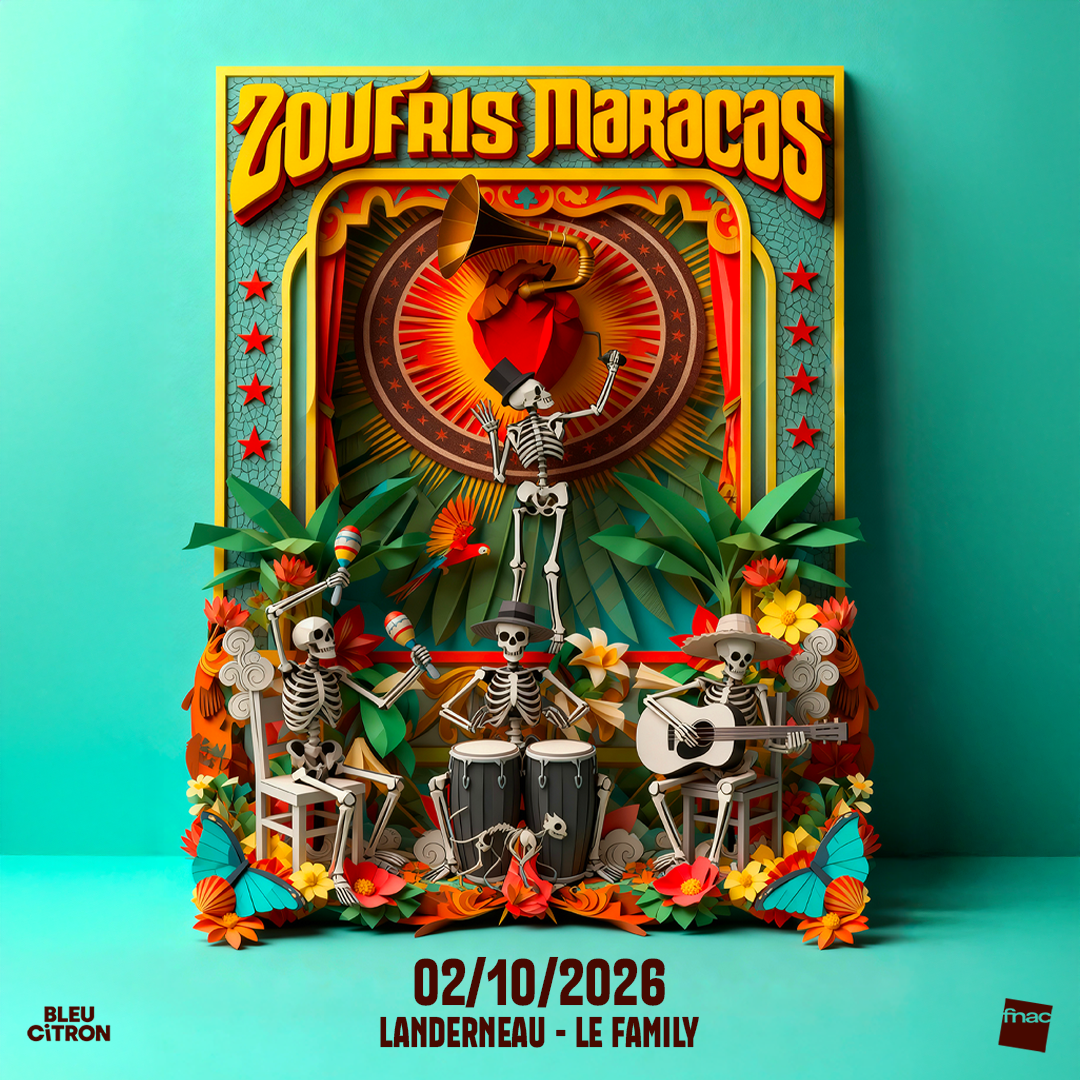 Altermondialistes et sans frontières. Militants et apolitiques. Écolos et parasites d’une chanson française dont ils bousculent les codes avec leurs guitares chamarrées et leurs mélodies du bout du monde, les Zoufris Maracas ne rentrent pas dans les cases ! Fidèles à leur soif de liberté, proches des préoccupations actuelles, ils réussissent mieux que jamais à marier poésie des textes, engagement social, et voyages musicaux. Souvent comparé à la Mano Negra ou aux Négresse Vertes, le groupe s’est imposé en 4 albums et plus de 700 concerts comme une référence de la scène alternative française. Leur force est leur musique, leurs textes, le bouche à oreille et une furieuse envie de danser sur des sujets sérieux. Zoufris Maracas au Family à Landerneau le 2 octobre 2026, un rendez-vous à ne pas louper !